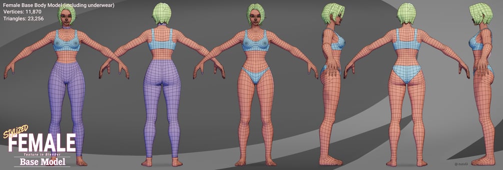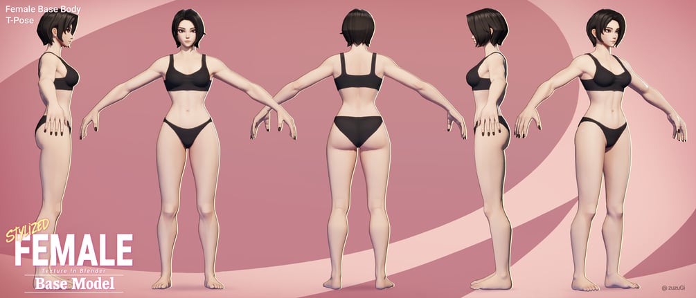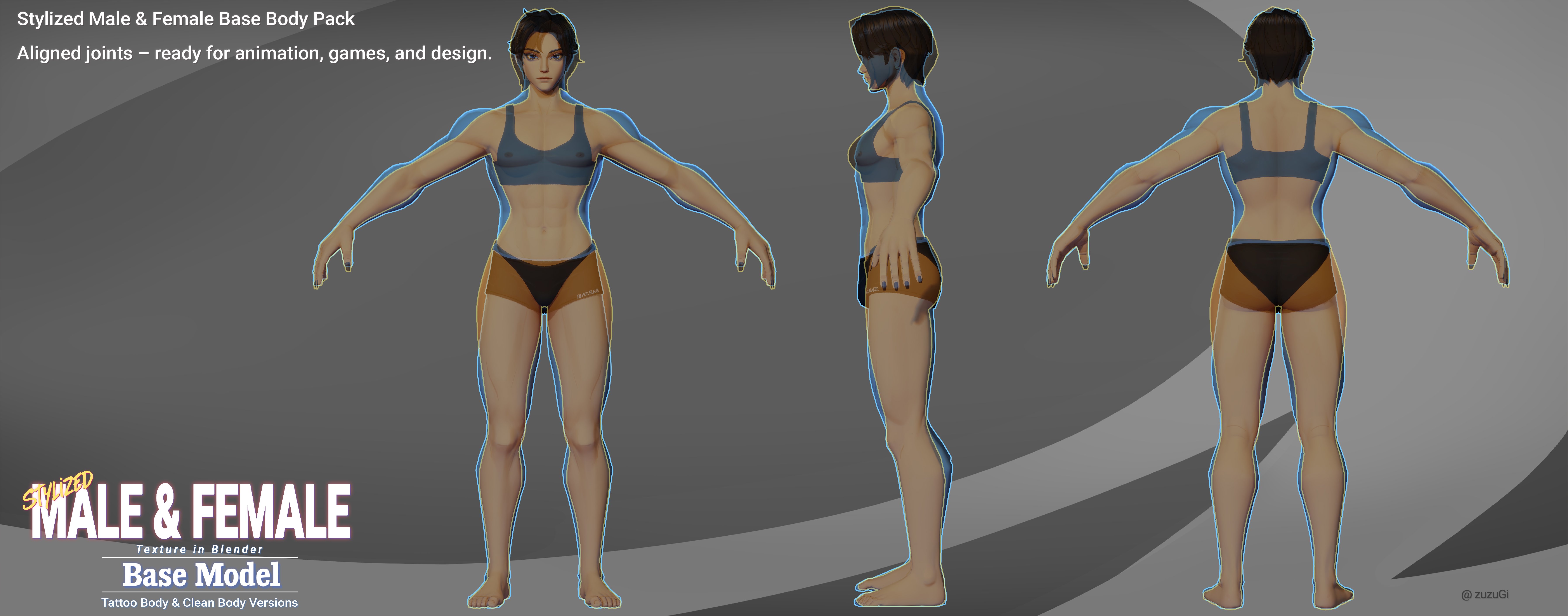 Two high-quality stylized base body models (male and female), each with rigged Blender files, ZBrush high-poly sources, and 4K clean & tattooed textures. The male and female rigs share identical joint positions, making them fully interchangeable and compatible in the same projects. Perfect for games, animation, and design.