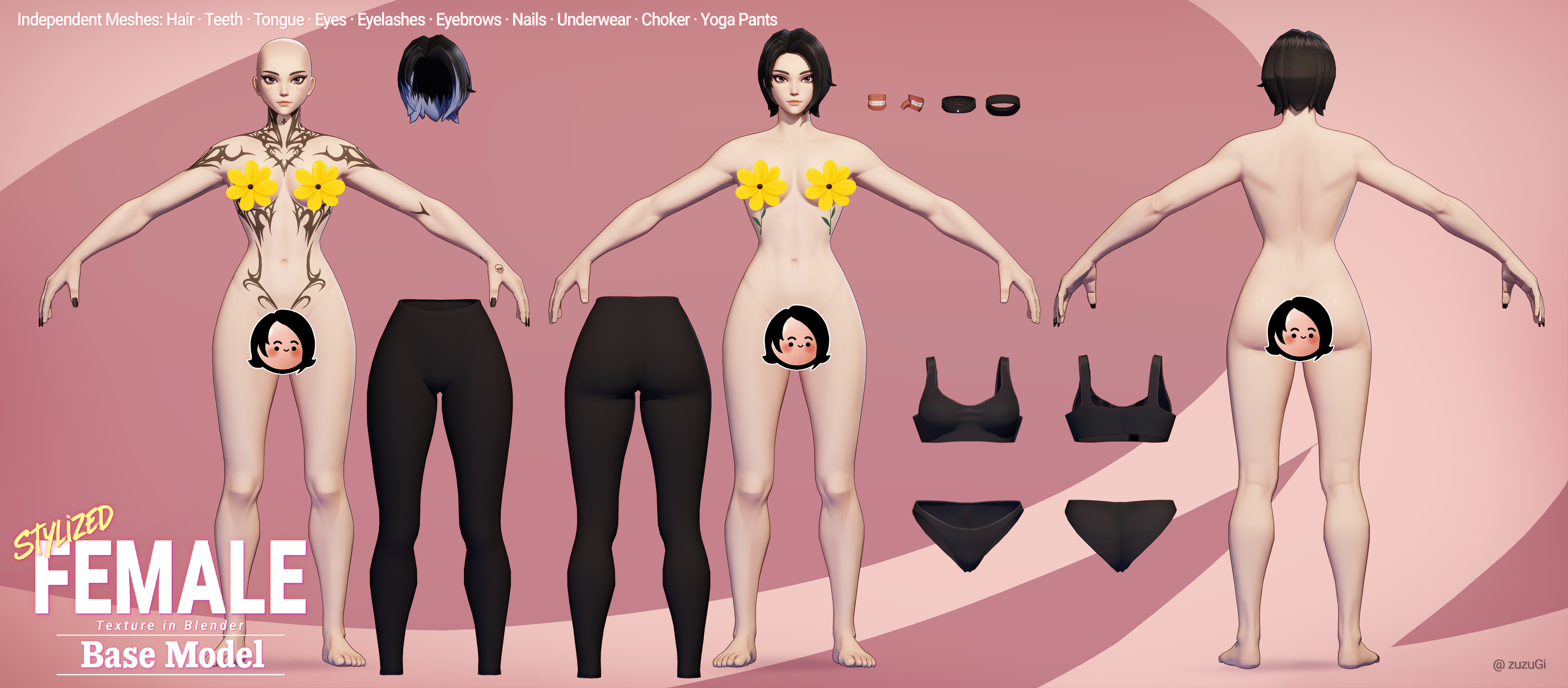 • Female: eyebrows, eyelashes, eyeballs, teeth, tongue, hair, underwear, choker, yoga pants