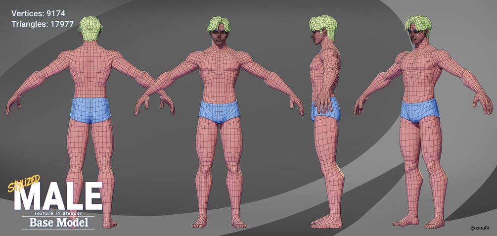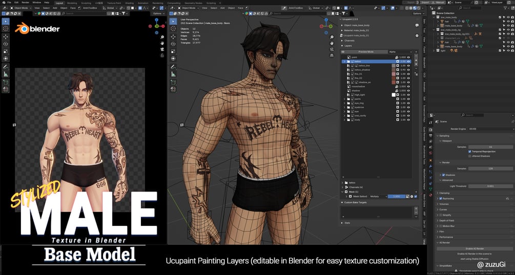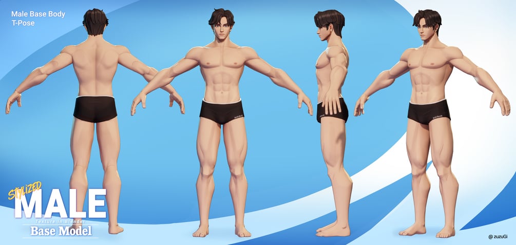 High-quality stylized male base body with rigged Blender file, ZBrush high-poly source, and 4K clean & tattooed textures. Perfect for games, animation, and design.
