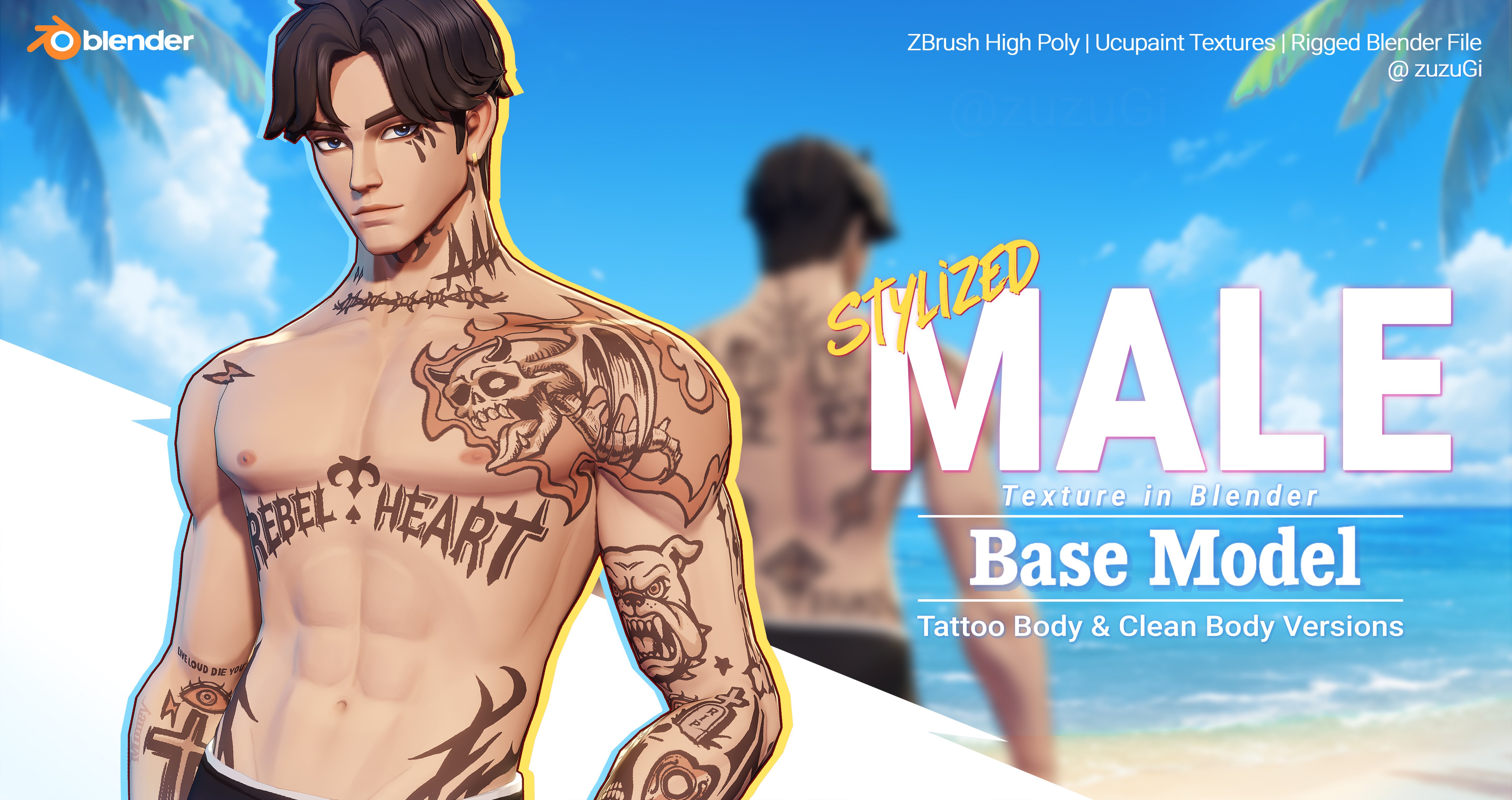 High-quality stylized male base body with rigged Blender file, ZBrush high-poly source, and 4K clean & tattooed textures. Perfect for games, animation, and design.